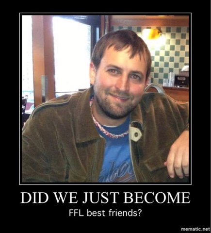 Oooooooooooooooook, lets get caught up on a few missing weeks. Cats won about half their games, the Capt went on a winning streak that pulled him from the losers playoffs to a possible #1 seed. LO is right there at the top, as is Grider (though not as safe) and Pigg (same as Grider). The Commish and DSVP are struggling to be the top dog in the bracket of shame. TSMYTDs goes into the last week as #8, but within striking distance. 5 teams are playing in week 14 for only 4 spots in the promised land. Parity in the NFL has come to “This is Serious Business” and no team has broken away. In the East, Cats and LO are 8-5 with Grider one back at 7-6. In the usually horrid West division, TBIAC is 8-5 with Pigg hunting him down at 7-6. And to make it even more fun, the FFL Gods have set a great lineup for us this weekend!!