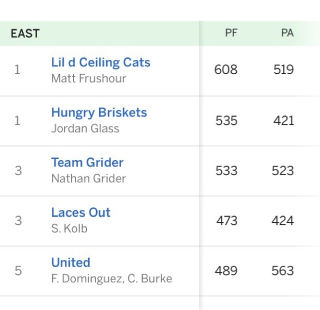 Grider v LO. In an epic showdown of former Championship game losers (both to the Cats), nothing was held back, except lack of talent and roster strength. Which neither seems to have. Grider 78-71 over the tiny, angry LO. When your K is your highest scorer of the week, you usually lose (exception below) and LO’s K had 21 and her RB’s had 11 and 2. Not to be outdone in FFL ineptitude, Grider had a 7 at QB, 0 at TE and only 2 from K. And won. Seriously. Wow.