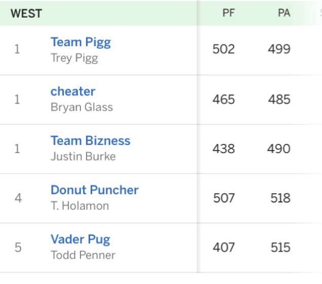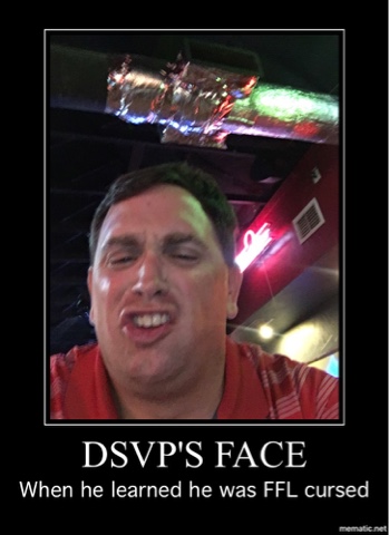DSVP v TBIAC This was just what we thought it would be. Boring. DSVP goes down 98-76. Melvin Gordon goes off for 27, but DSVP matched that with Dak’s 29. Jackson had 10 and Pug’s Hill had 12. Unfortunately for DSVP, that was the end of the matching. The rest of his team failed at FFL’ing. The Capt put a nice week together, despite missing out on some really good trade offers. We will see what week 6 brings for these two warriors.