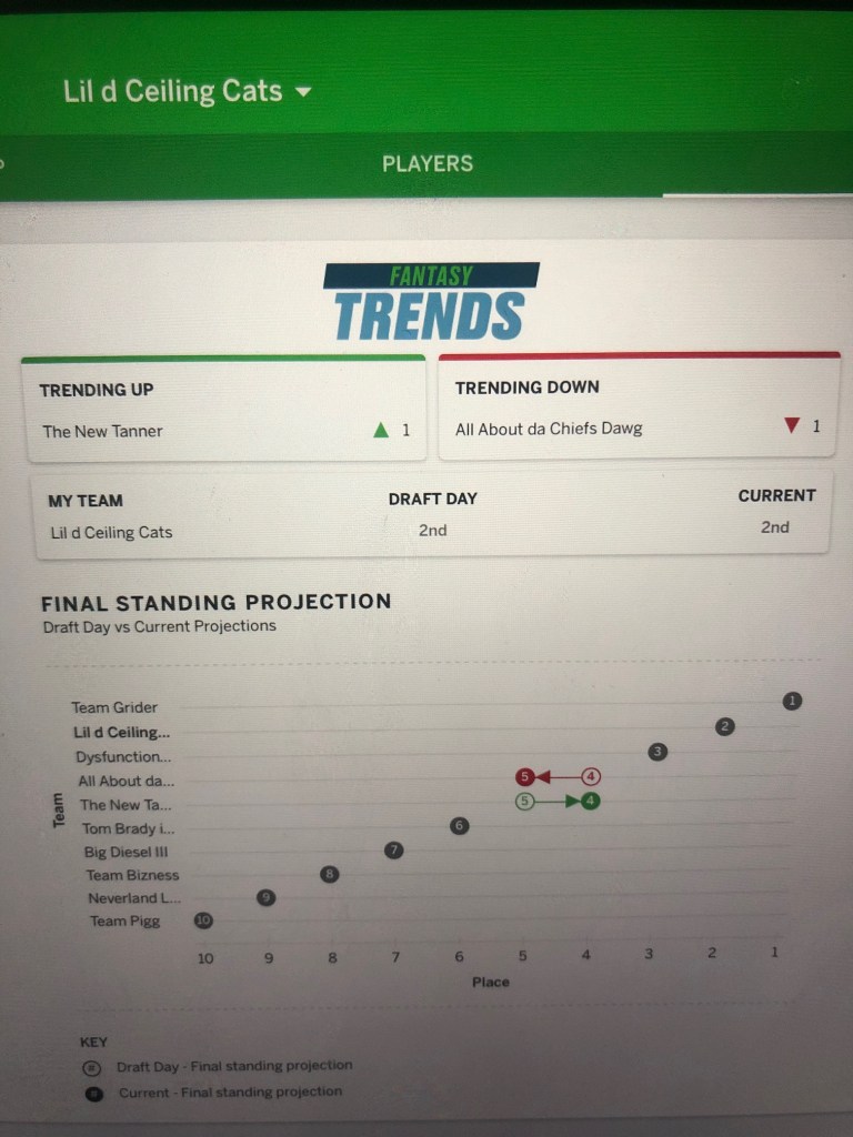 New Tanner sporting a new name and a new team in a new season. Old result, loss. 168-80. Dak and Zeke and Julio did their part but Connor went down with an ankle injury and scored zip., Engram with a goose egg, Perriman snagged a tough 1 pt and the TB Def looked as old as TB12. Cats starters scored 13 TDS (that’ll happen every week) led by the rookie CEH, who DSVP claimed to be a bust pick😂. Jacobs with 31, Thielen and Ridley combined for 50 and Akers, the disappointment, 3. New Tanner will bounce back and the Cats probably won’t score 160 every week. Week 2 will tell us more about all of us…