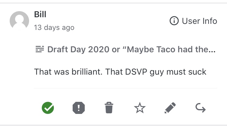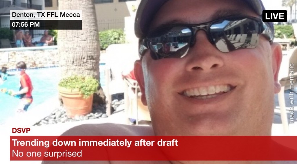 One hour before draft kickoff we sadly lost one of our own, TSMYTD’s aka Taco aka Tanner. The coroner’s report showed a toxic mix of FFL failure and computer incompetence. Godspeed sweet, sweet Taco, your two easy W’s every season will be sorely missed.