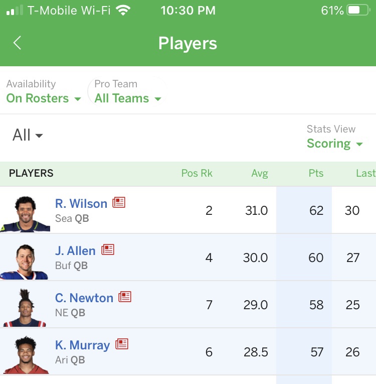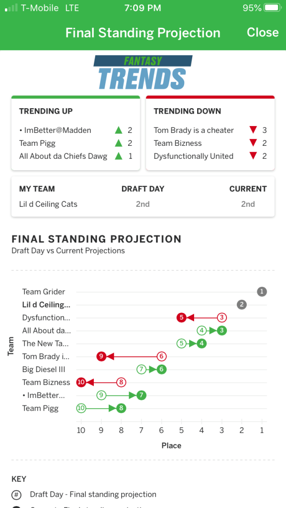 Well… Bill is not happy tonight, DSVP wins 124-110. Mattey Ice tied Mahomie with 27. Jones outscore Kamara 40-28. Taylor, took over after injury, tied Mostert, injured. but the Pugs WRs outscored Pigg’s 23-3 and even J Tucker’s 16 couldn’t make up for a Ten D 0 and Michel 1. Big win for Chief Dawgs, heartbreaking loss for Pigg. 2-0 ties the Commish for top of the East division, while the dumpster fire West Division is all tied at 1-1 except Biz, who’s 0-12 somehow.