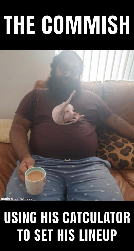 And the finale, DSVP v Pigg. Team Pigg who’s been voted best trade partner by the Cats and overwhelmingly liked by all FFLers vs DSVP who was voted by Bill, a commentor, to suck.