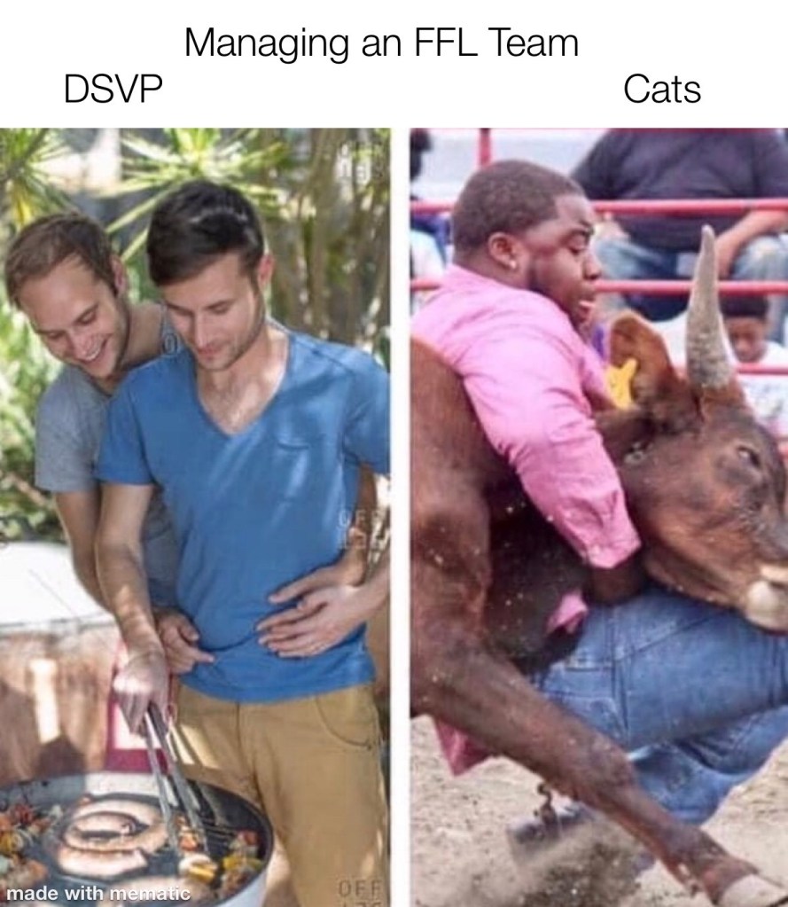 Sooooooo, here we go again! We’ve got at least one week before this whole thing is shutdown😩. Have fun, send your money in so the Cats can collect at the end of the year, and if you know a sucker who wants an auto draft team with 16 WRs let us know ASAP.