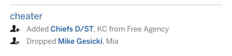 The Champ, TBIAC, back for year 23 of “This is Serious Business” FFL action. As usual, the Cheaters have a solid if not unspectacular roster. Russ at QB, Chubb and the soon to be incarcerated Mixon at RB and some other dudes to fill up roster spots. Bench looks solid if no other teams were in the league. Fournette was a bold stroke, we shall see if it pays off. Repeat looks doubtful, but that’s what this FFL mastermind wants us to think.