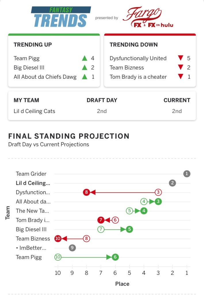 #2 the Lil d Ceiling Cats. At first glance, overrated. Too much reliance on rookie RBs, took 3 QBs for some reason and as usually WR looks like a group from the excellent Keanu Reeves movie “the Replacements”. The all time trophy leader looks like a Sacko contestant, unless Cam Newton becomes Superman again, Dobbins takes over the lead roll in BAL and Cam Akers is the new Todd Gurley. Prediction…. Champ