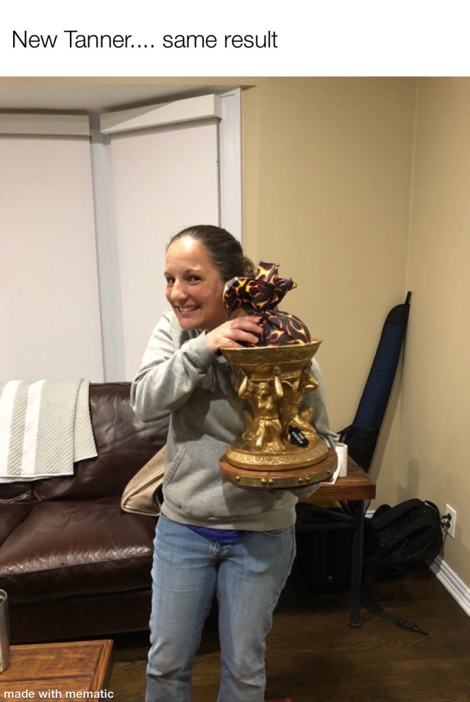 On a related note, the Sacko winner, Laces Out, was renamed by the current champ for the 2020 season. Let’s give a big shoutout to Team “New Tanner” and hope she continues the traditions of her forefather (losing, not setting a lineup, dropping Drew Brees into waivers to pick up a Defense, etc).