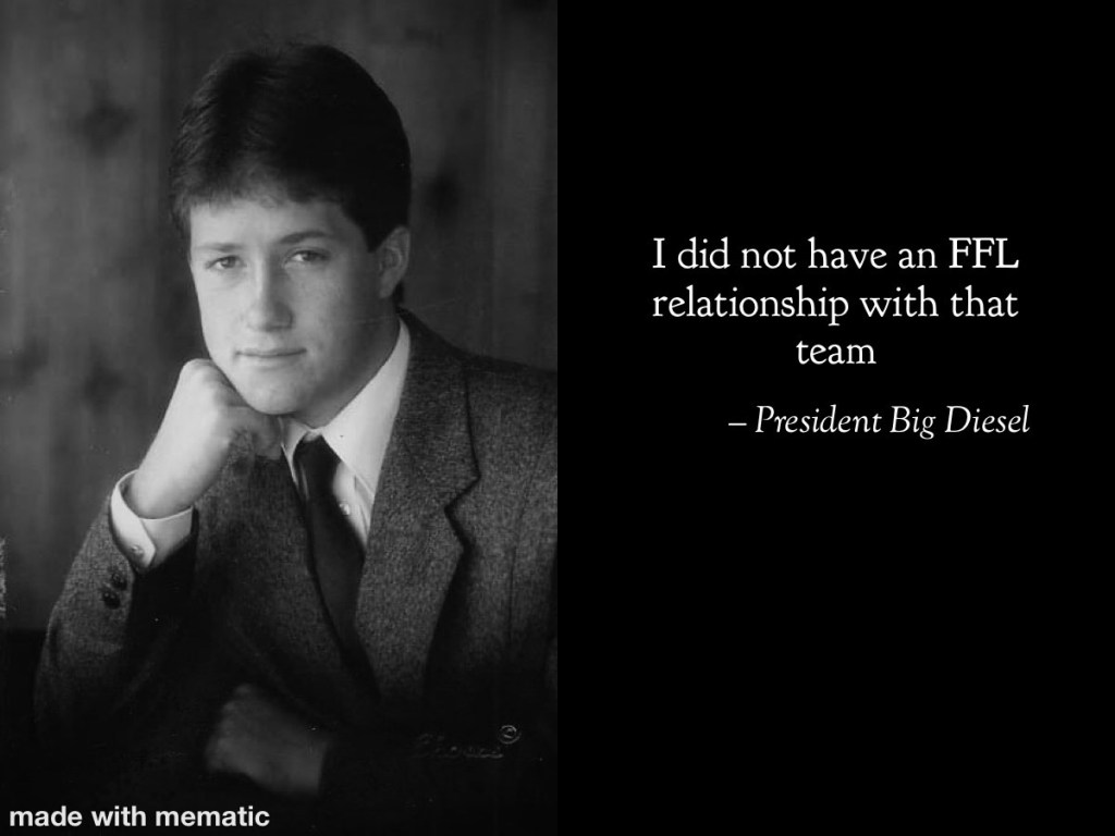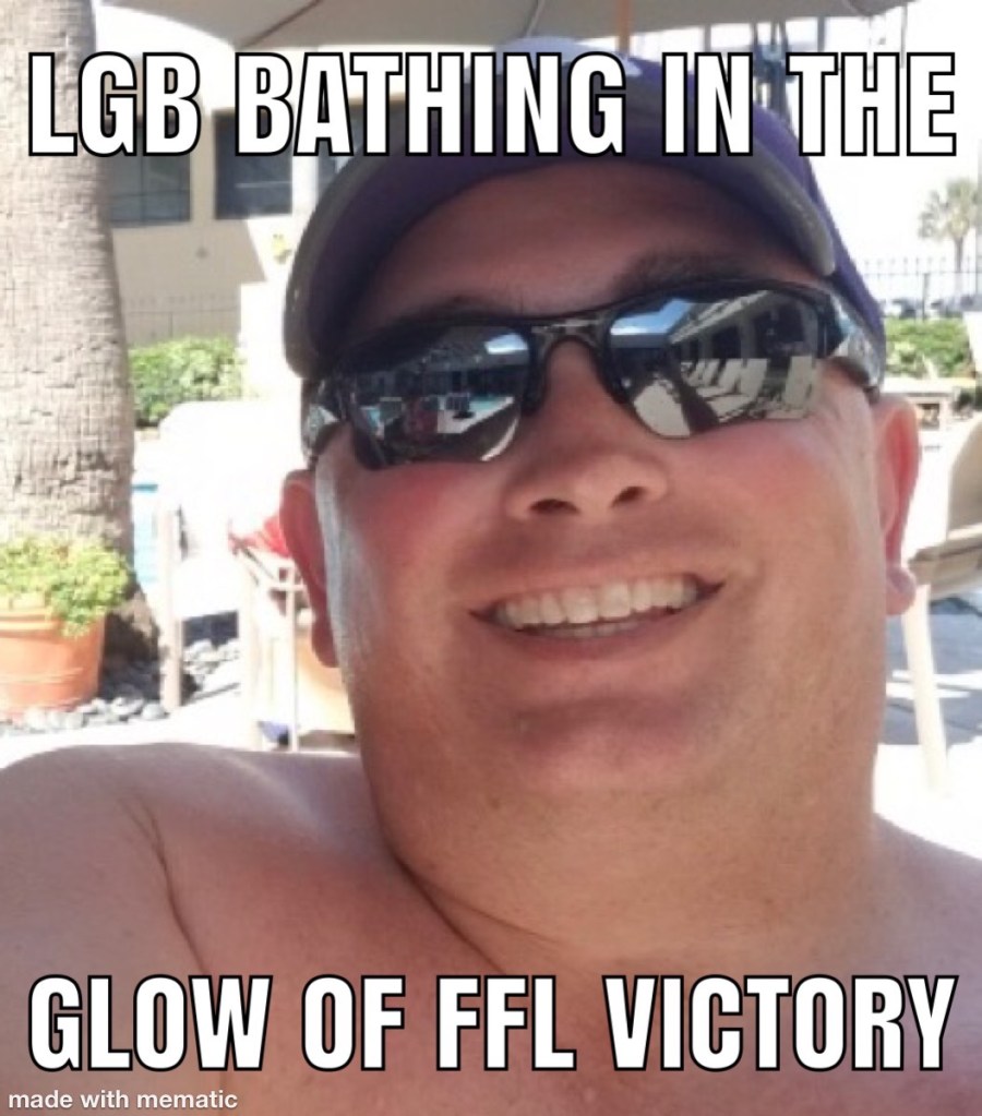 And here we go. When we changed platforms (forced by the Commish) we knew there would be some changes, some issues, some problems. The tenths of points were one of them. But really, how many time will it matter? And seriously, a half point is 5 yards rushing or receiving. It will literally never matter. And then it did. Pigg was watching Monday Night Football, staring intently at his phone and the tv. His arch rival, LGB sat at 90.38 pts. Pigg had one player left, David Montgomery, RB for da Bears. He had 62 yards and a TD and now the team was running out the clock. Pigg was down by .24 of a point. One hand off, 1 yard, run out the clock, game over and FFL W in the bag. All that was left was the snap, the handoff, the carry, times runs out, game over. Exactly as planned! Except it was the Bears 3rd string RB, don’t know his name, no one knows his name. His coach said “Hey you, running guy, go run” or something like that. He got the carry. FFL loss… by .25 points. LGB steals the election, ummm, I mean game!