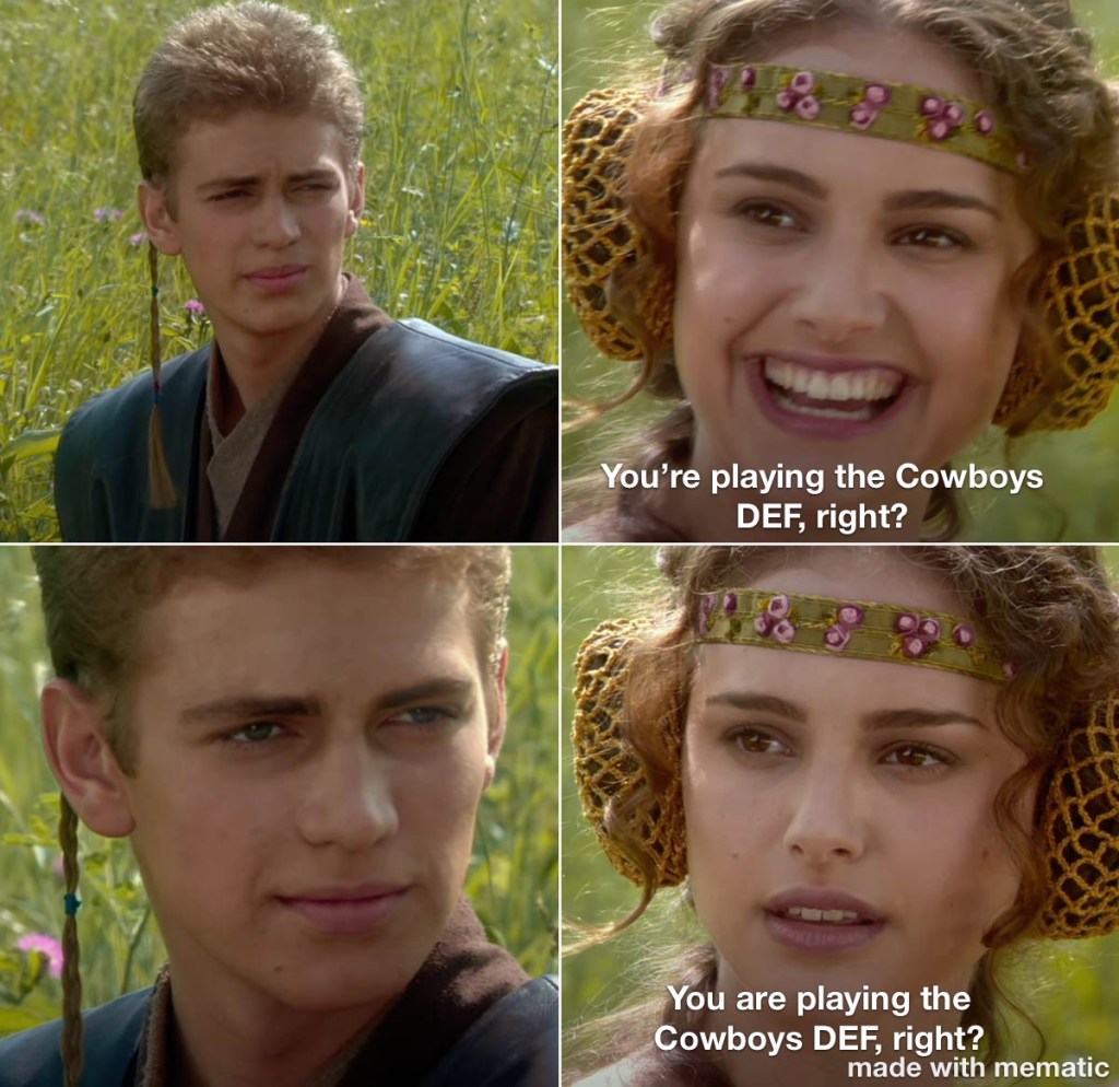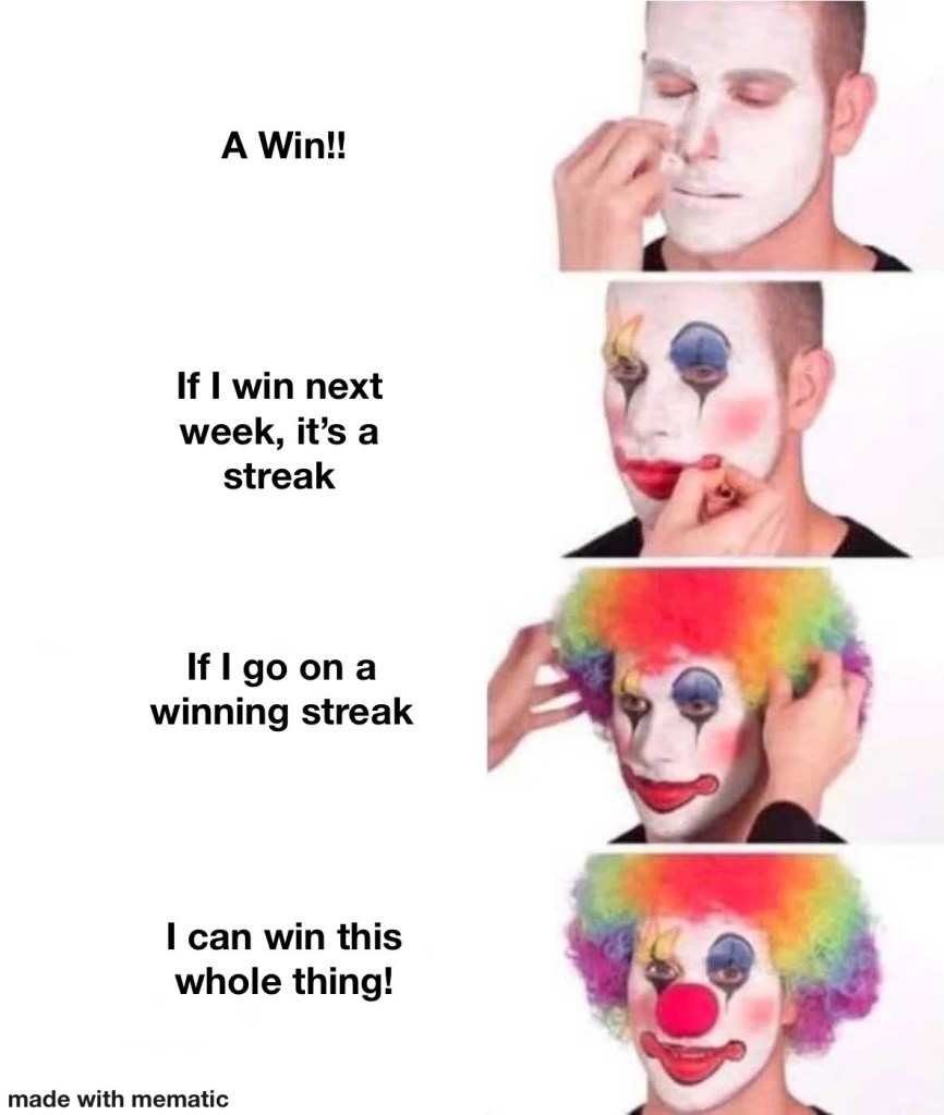 Yup, it happened. And it happened to LO, who had gotten real comfortable sitting on her high horse near the top of the standings (her feet still didn’t touch the floor). But in FFL there is no given, no easy W. As it has been all season, K and Def made an impact. LO’s totaled 5, DFUN’s 31pts. Herbert beat Raaaaaawwwwdddggggeeeerrrrss by 2, Ekeler outscored Drake by 23. On the flip side Foreman was up 6 on Waddle, the rest was a wash. Offensive players were 72-63 in Laces Out’s favor. But it’s a team game and this week it payed off for the Commish and his first win of the campaign, 94-77.