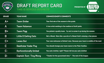 Week 3 brought some sanity to the madness of an undefeated DFUN and an 0-2 Ceiling Cats and the Capt. LO, Pug, and Holamon end the week at 1-2; DFUN ties Grider at 2-1 and despite the fact that his team/head coach/GM make Jerry Jones and the Cowboys look good, Pigg remains undefeated! No one is outta this thing yet,