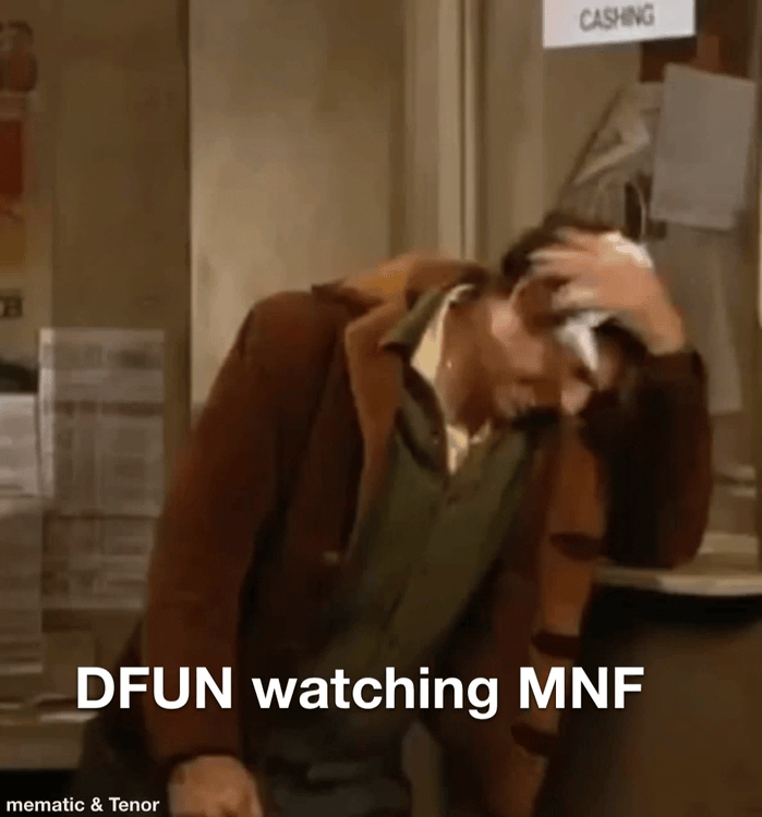 In a game that all (Screamin A Smith, Bayless and George Dunham) agreed was the trap game of the week, the Commish rolled into the Broken Spoke (not much of a stadium, more of a honky tonk) to face off with the undefeated, top scoring, loudest smack talker in TISB, AintReba. DFUN came out swinging, taking an early lead. Jacobs 20, Njoku 23 and Amon 25. AintReba countered with 0 from DSmith, 2 from Koo and only 9 from JCook. Monday Night came along and the experts looked like experts… DFUN was up 45. Reba only had two players left. But their names were DHenry and Lamar. So the audience watched, silent, worried, excited. There was talk of saving the game tickets to hand down to their grandchildren. Selfies were taken, tears were shed. This was the week! The curse was going to be lifted, and by the least imaginable team in the league. DFUN began to celebrate. Too early. Lamar was everywhere all at once, running and kind of throwing the ball. The win % went from 72-68. DHenry was bottled up, struggling to get past a stacked box. Lamar tossed another TD and the % dropped again. There was hope in the stadium that night. Halftime came and DHenry had 8 points. Then it got real, like the nightmare Felix has had every night since. DHenry breaks a long run, Lamar keeps passing TDs. Then the King does it again, and Lamar does it again. And then again. Jackson ended the night with 5 TDs and 34 points, DHenry 169 yds and a touchdown for 25. Commish falls by 15, 124-139. No lead is safe in TISB. And no one is safe from the terror we call AintReba.