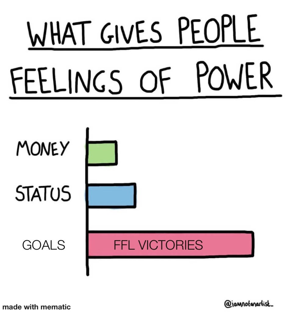 Soooo Week 7 is over and we are seeing who is setting up to be the most useless. AintReba’s dream season continues, TBIAC is close on her tiny little boot heels and the rest are flailing away week by week searching for continuity, or good decisions, or healthy players or just for the FFL Gods to be kind. Lots of fake foosball to be played. Let’s get to this weeks recap of This Is Serious Business!!