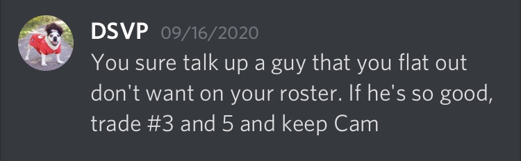 Another week, some losses, some wins, some ‘Rona. It’s 2020. Improvise, adapt, overcome😘. We as a league have decided to just roll with the punches that the pandemic has thrust upon us. Keep an eye on waivers, keep an eye on the news and set your lineups. And pray. It’s 2020.