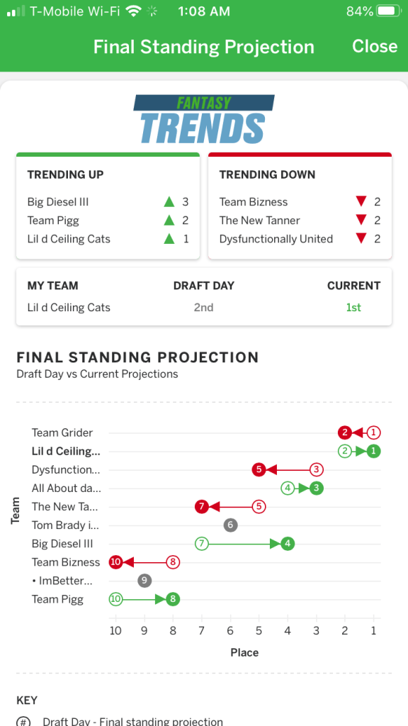 In the first, but not last battle between 2 FFL heavyweights, Grider versus Cats. Lots of bad blood between these two ever since the “TBIAC I never liked Grider story” (for a later time). As usual this was a slugfest. The winner had one thing the loser didn’t. A point. One damn point. It all came down to Monday Night Football, a Corona virus double header, with Grider up 9 and Travis Kelce and the Cats down 9 and playing Crosby at K, CEH at RB and the #1 scoring WR in all FFL, Calvin Ripley. Seemed like another easy W for the Leagues favorite team. Kelce caught 7, countered by CEH’s 8. Crosby kicked in 7. Down 1 for the Cats. Calvin Ridley, final stats 5 targets, 0 catches, 0 yards, 0 points. Grider wins 97-96. Fun game. Proof no lead is safe and no deficit is insurmountable (unless your DSVP). And another case of Grider paying off the refs, or ESPN or someone. This rematch should be fun!!!